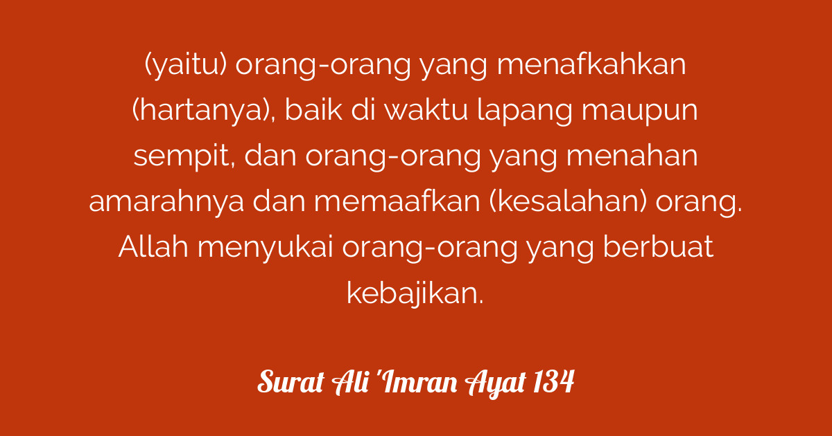 Sifat orang yang bertakwa adalah senantiasa menginfakkan hartanya baik itu di saat kaya maupun susah, menahan kemarahannya dengan bersabar, dan memaafkan orang yang bersalah terhadapnya.
